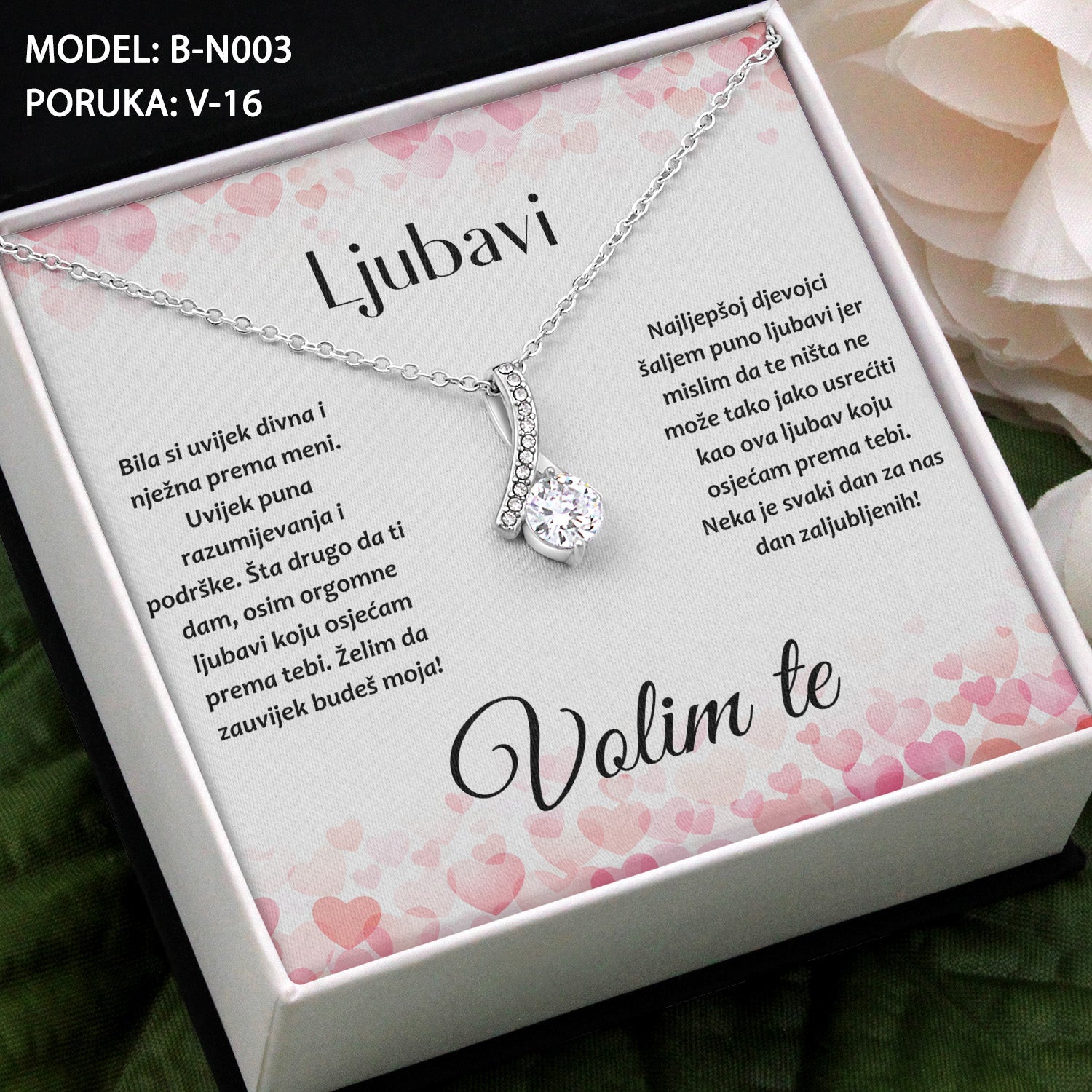 Obradujte Vašu voljenu osobu za Dan Zaljubljenih-Valentinovo ovim jedinstvenim poklonom! Poklon koji će joj zauvijek ostati u srcu. Lančić sa privjeskom i posvetom. Ovaj poklon je idealan poklon za rođendan, dan zaljubljenih, godišnjicu, 8. Mart ili jednostavno da iznenadite vašu suprugu ili djevojku, da joj pokažete koliko vam je stalo do nje.
