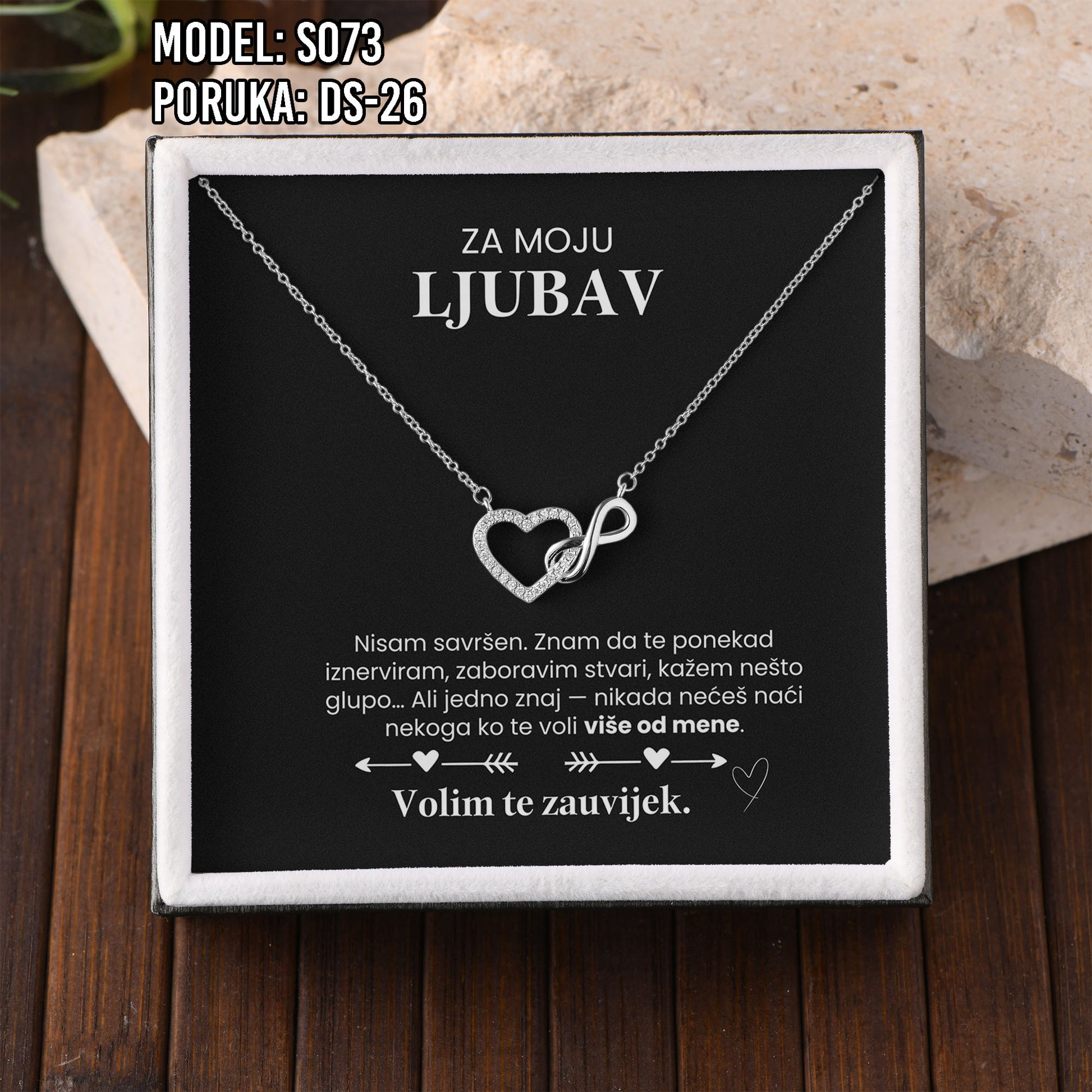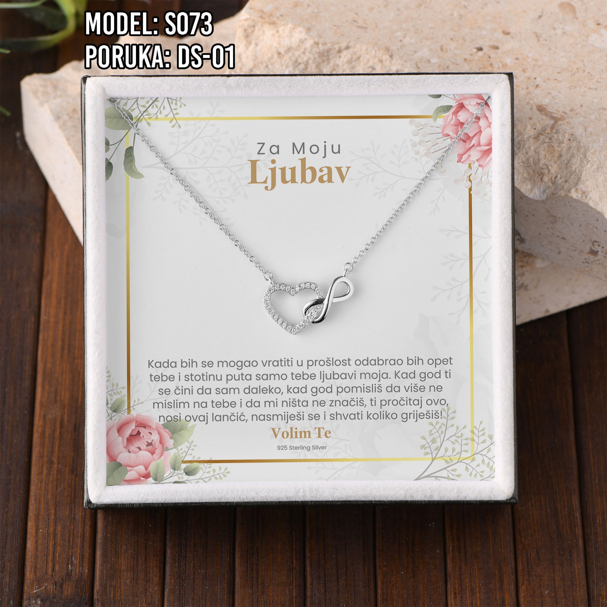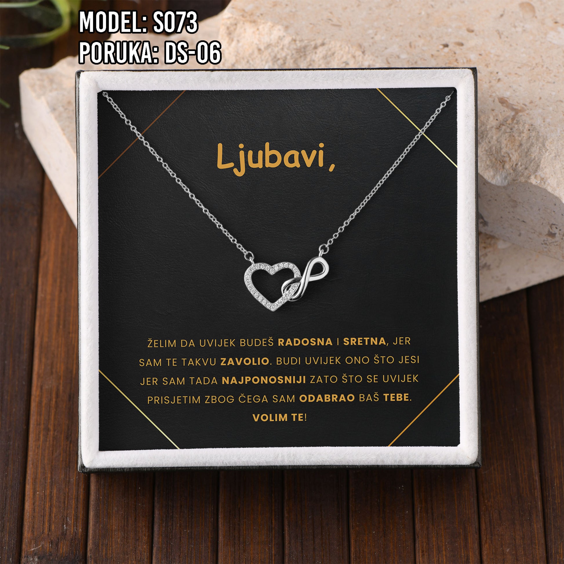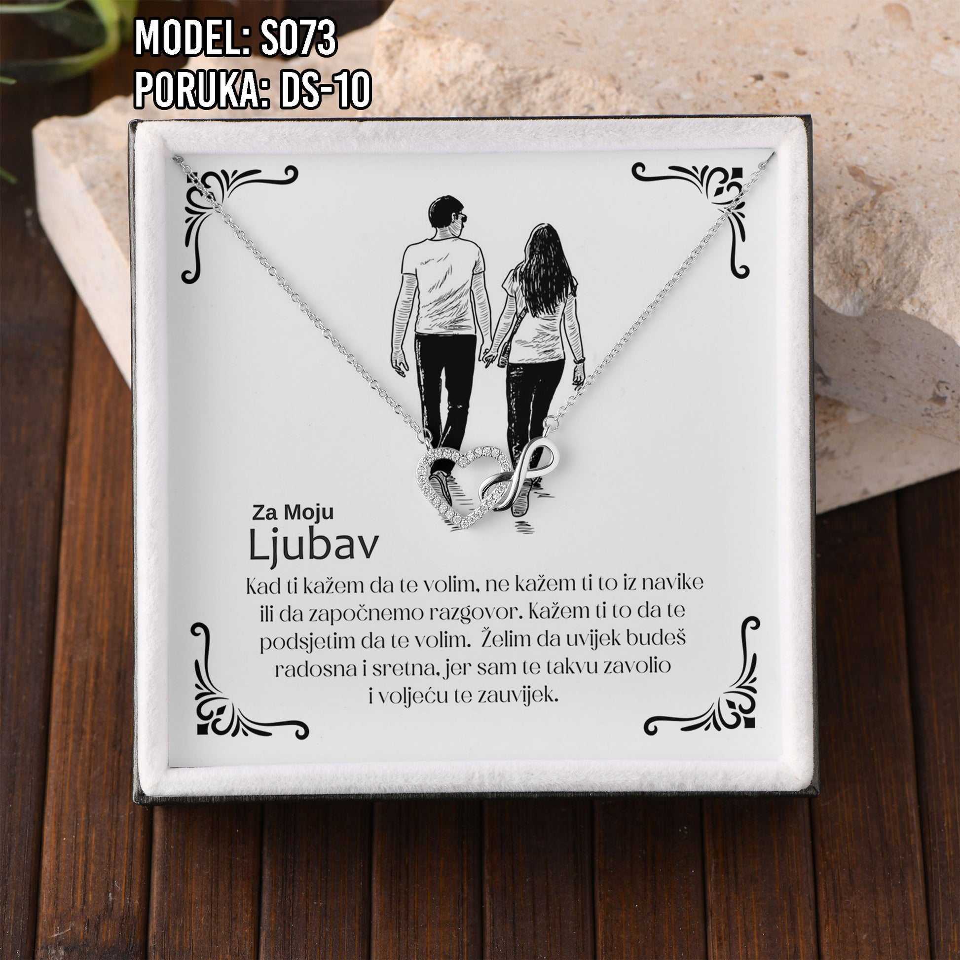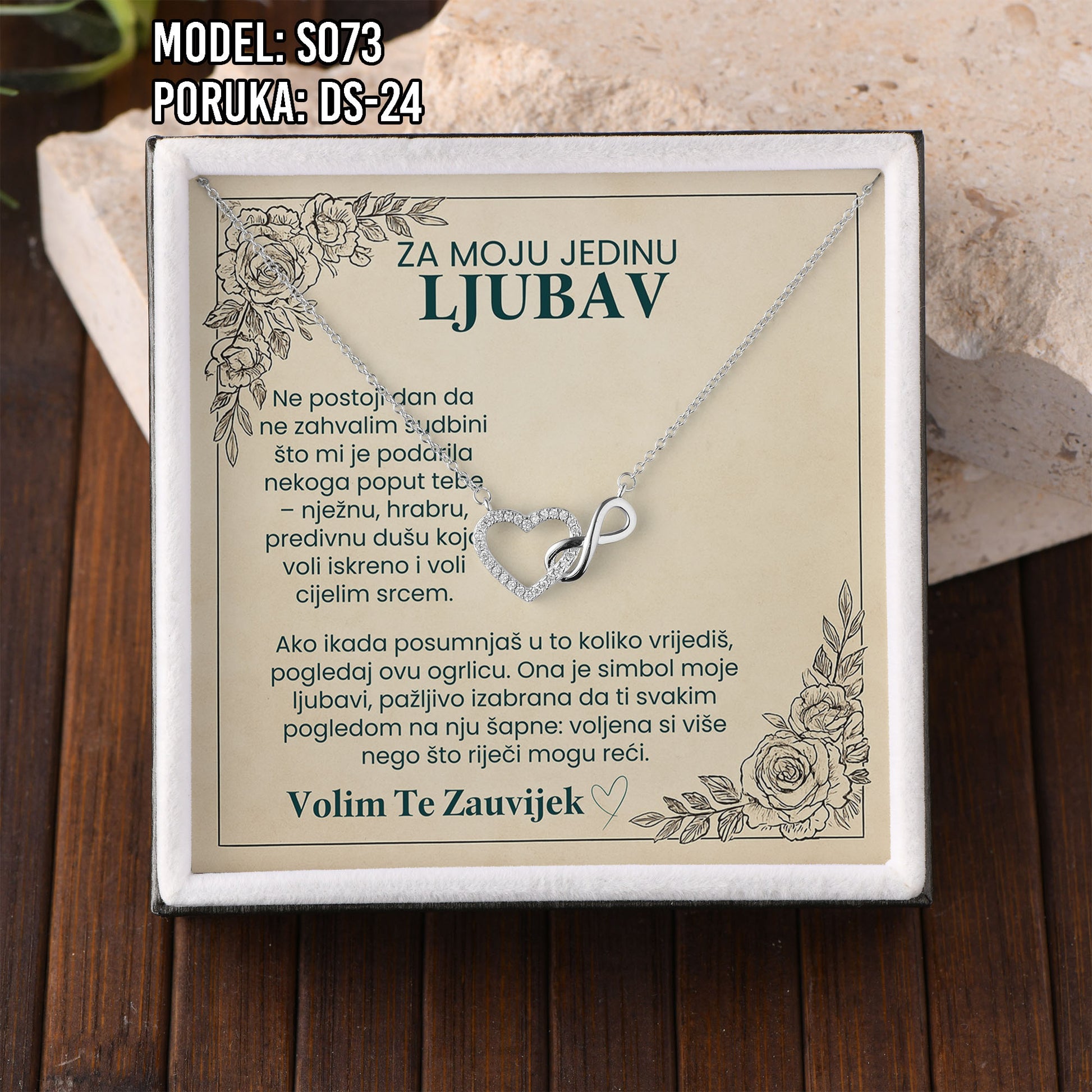 Poklon koji govori umjesto tebe. Model S073 spaja simbol srca i beskonačnosti – za ljubav koja traje. Savršen je izbor za Valentinovo, rođendan, godišnjicu ili kao nježan znak pažnje prema supruzi ili djevojci.