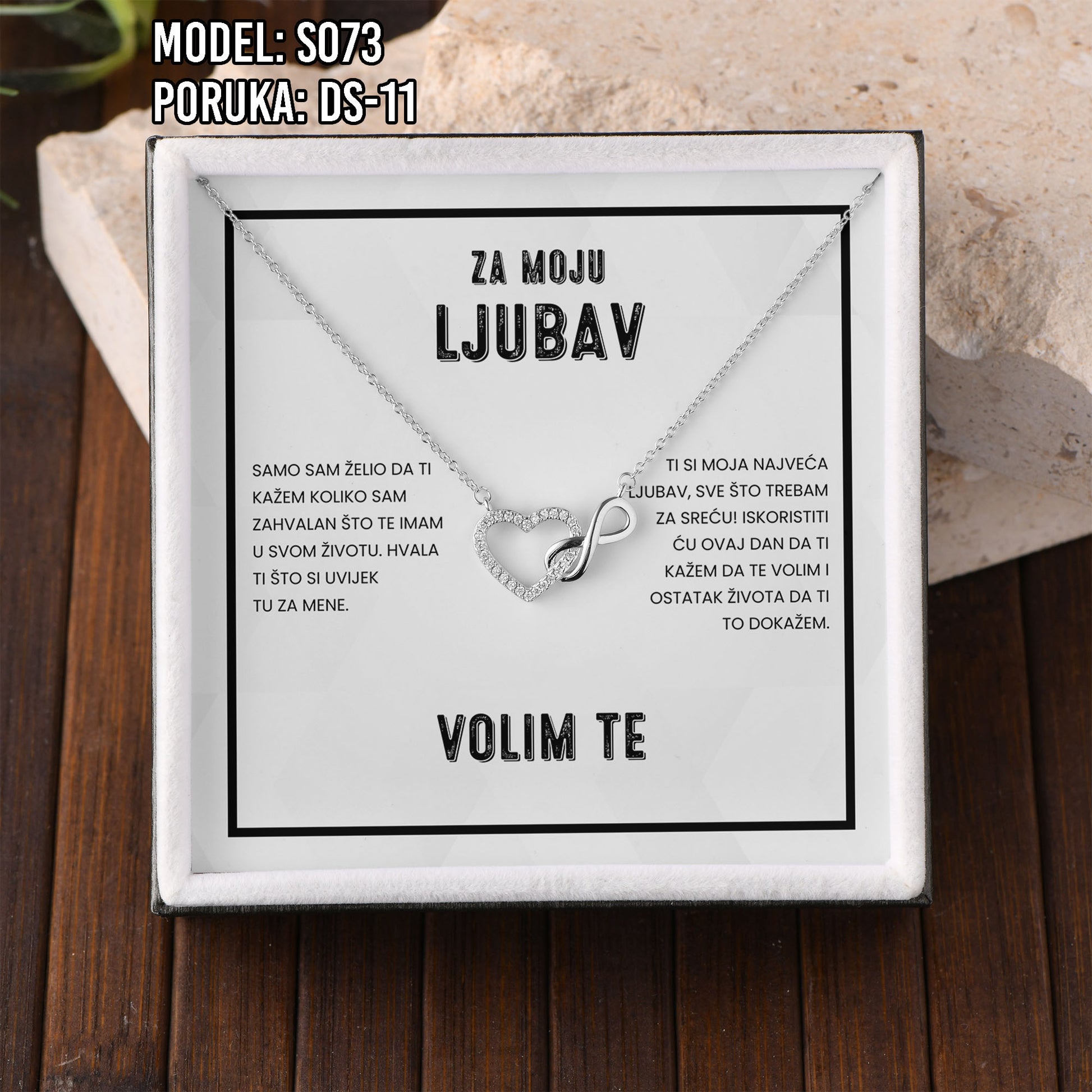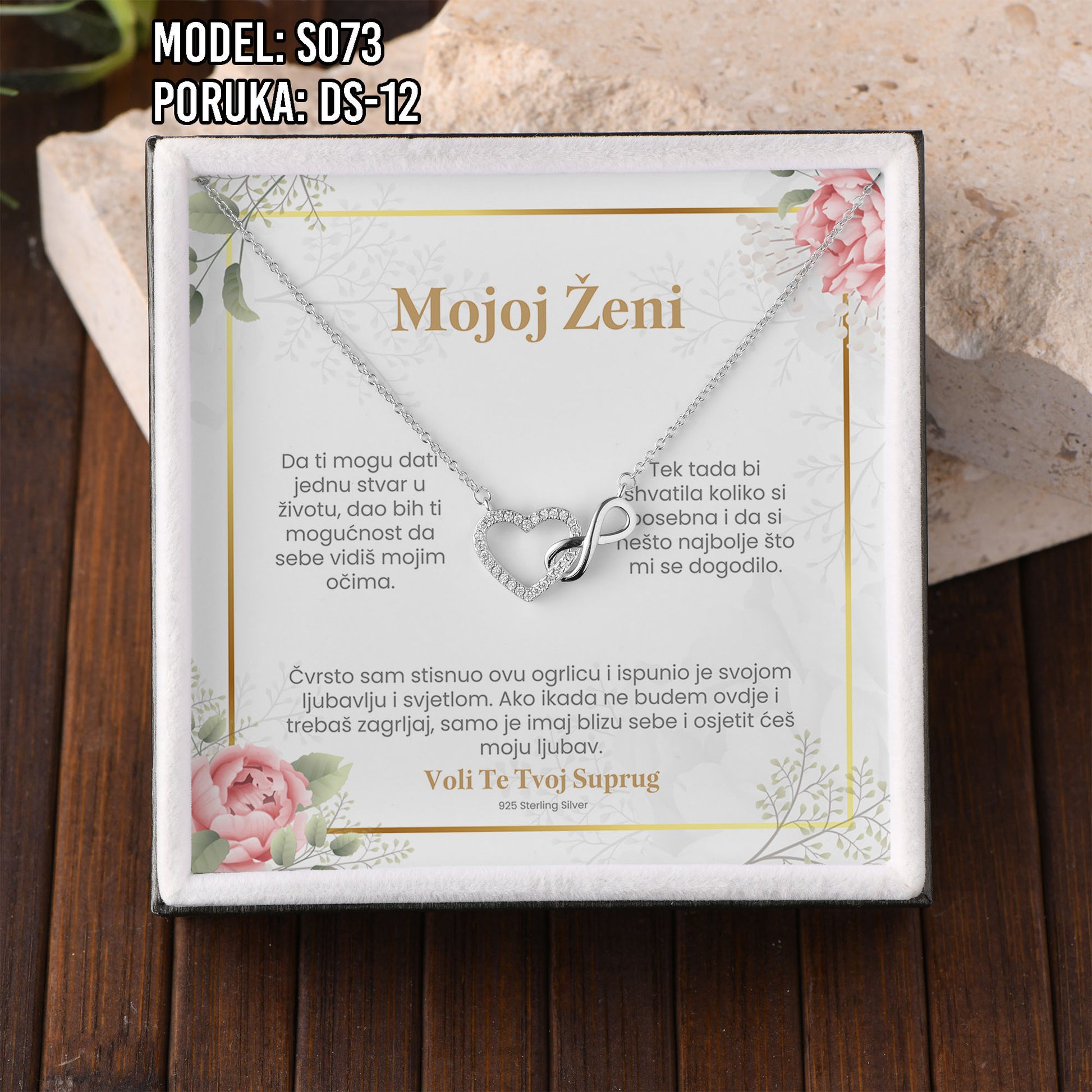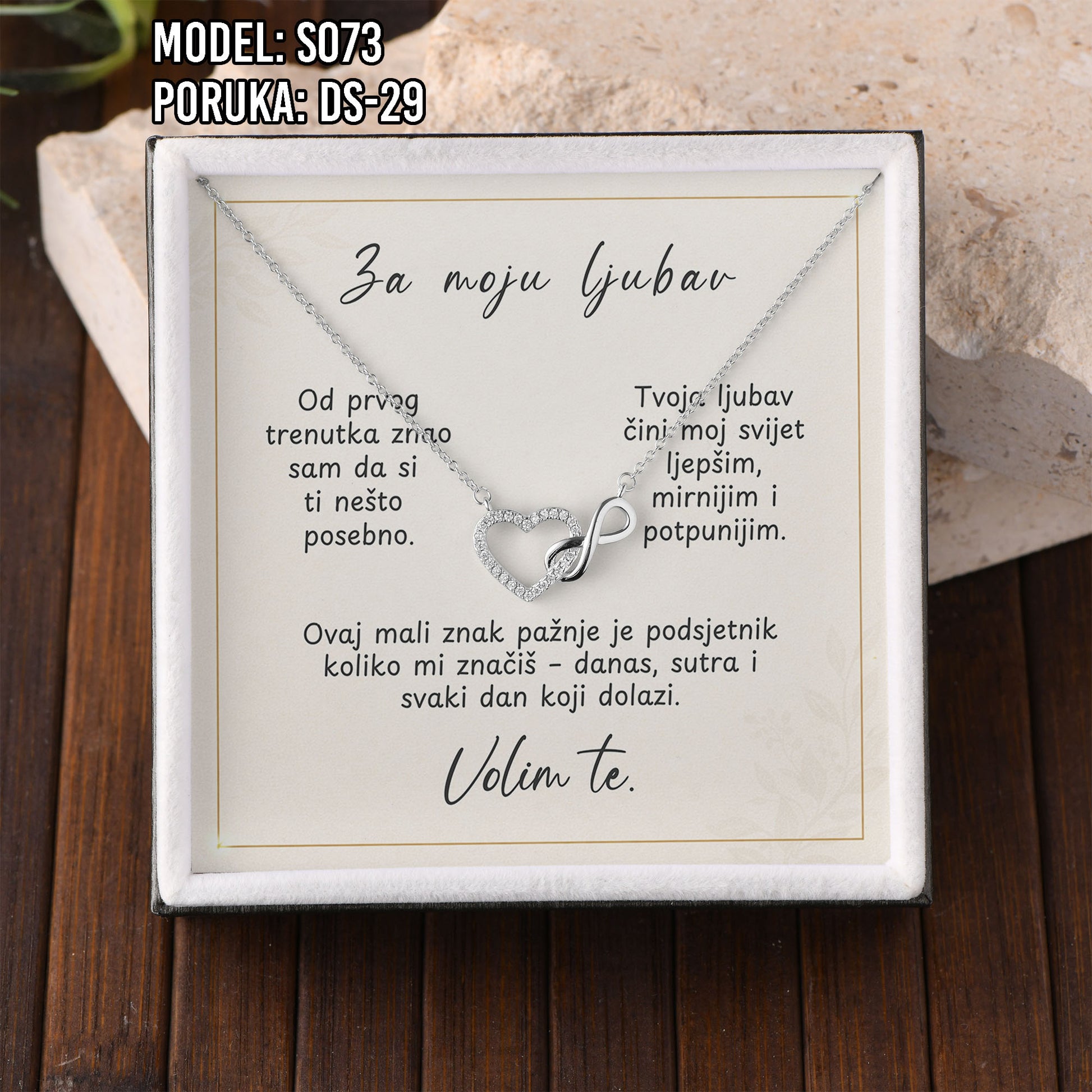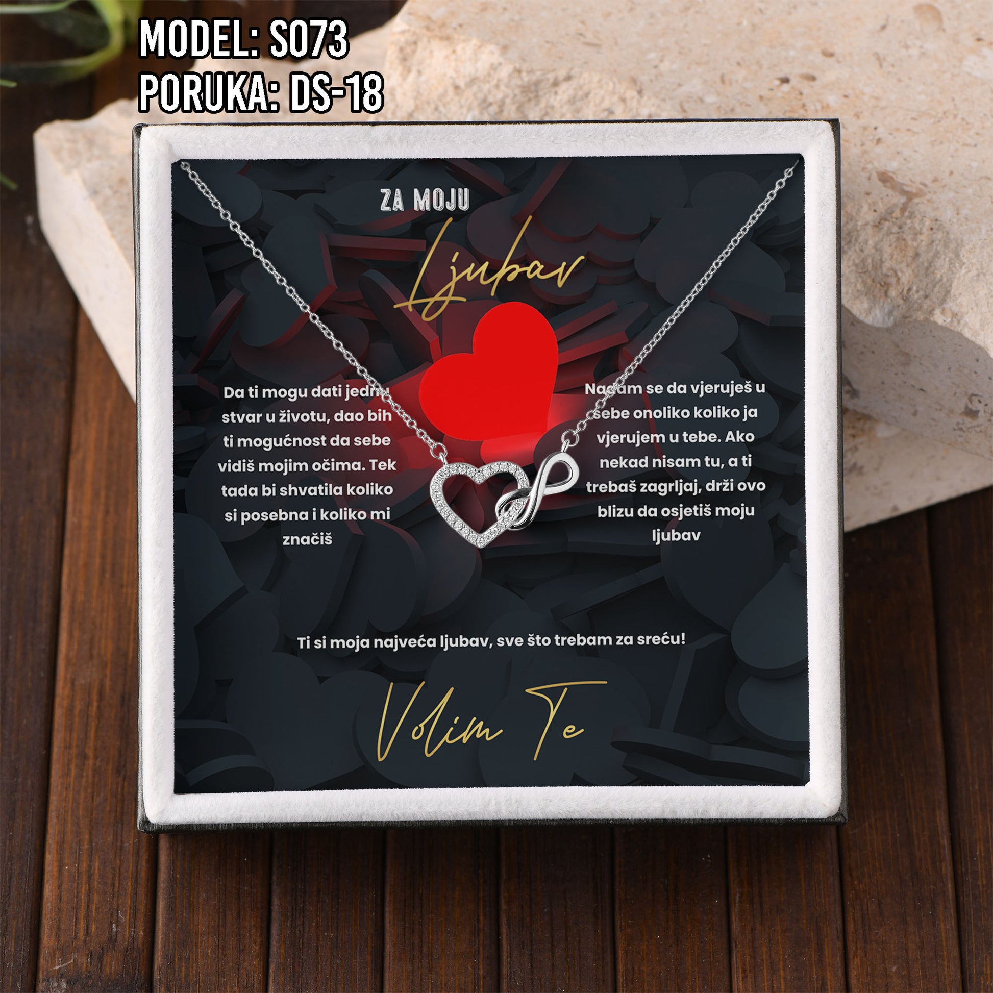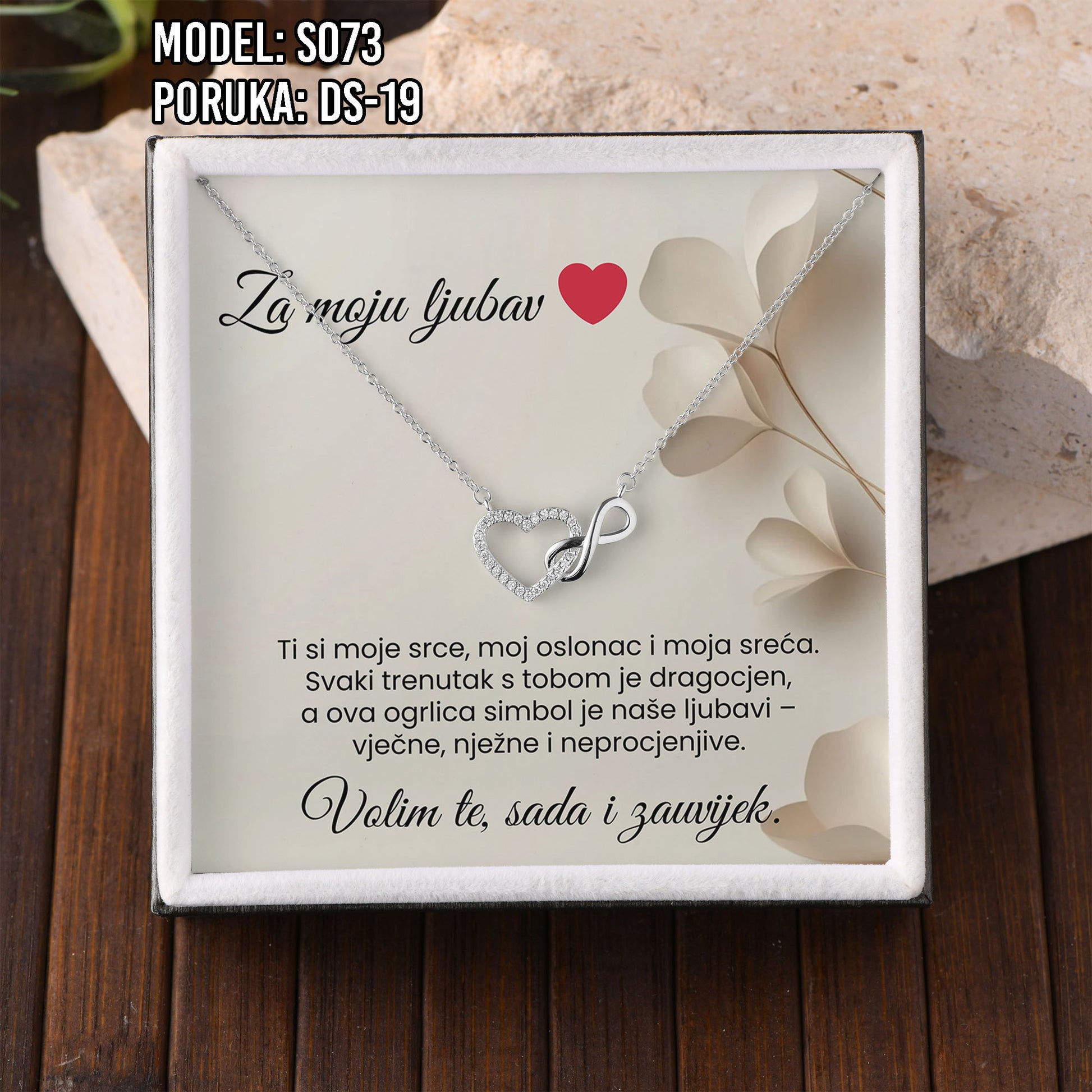 Poklon koji govori umjesto tebe. Model S073 spaja simbol srca i beskonačnosti – za ljubav koja traje. Savršen je izbor za Valentinovo, rođendan, godišnjicu ili kao nježan znak pažnje prema supruzi ili djevojci.