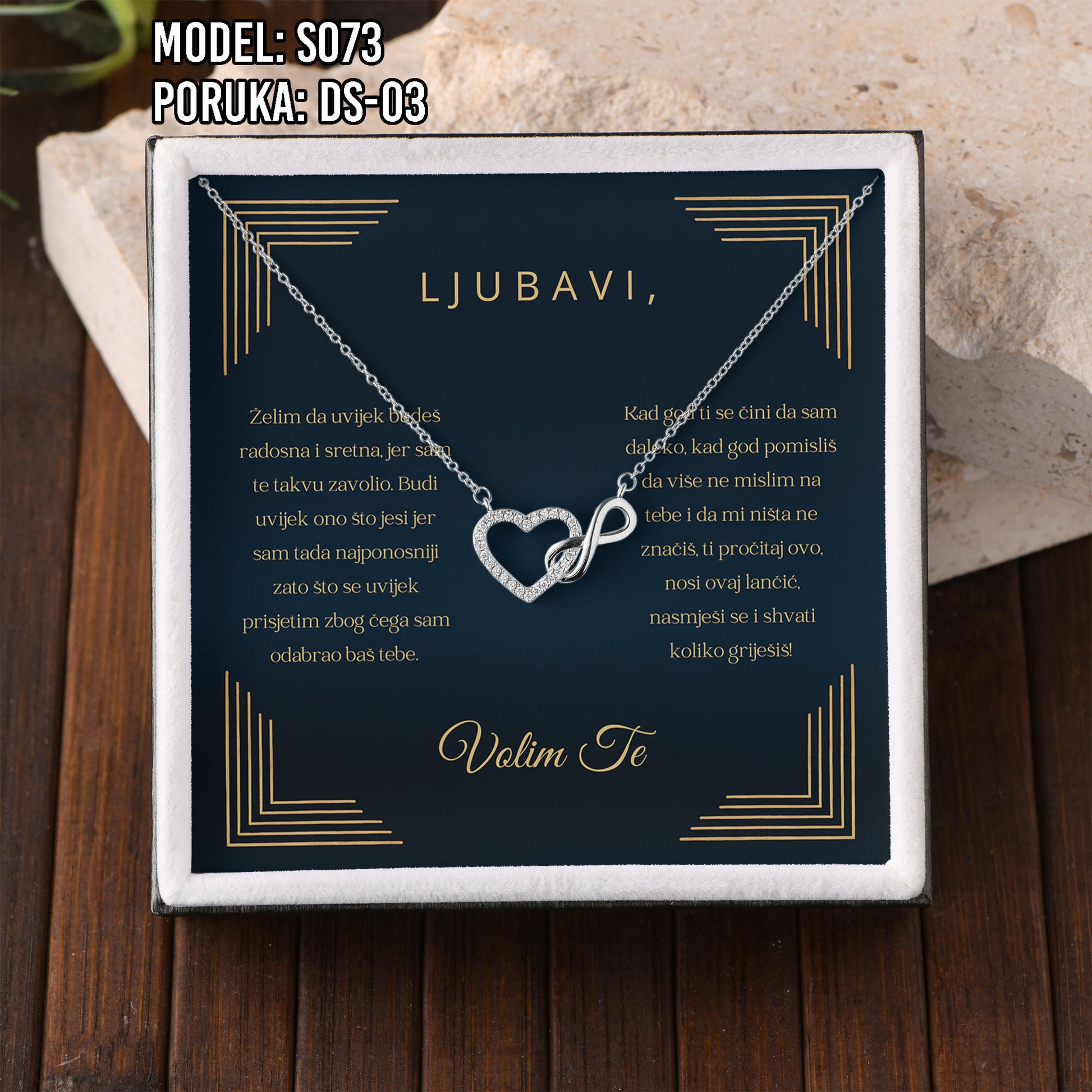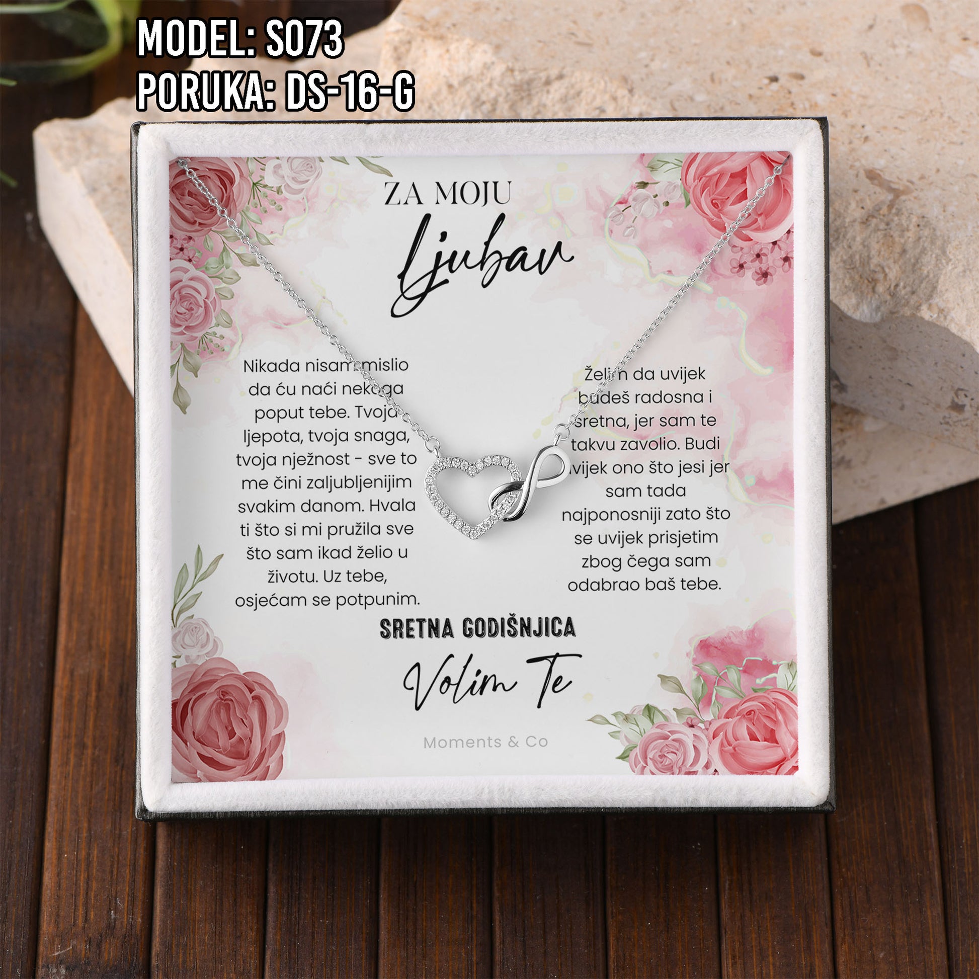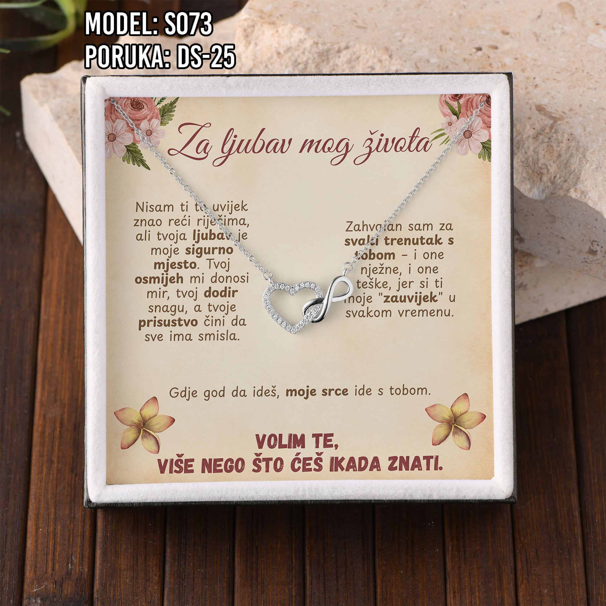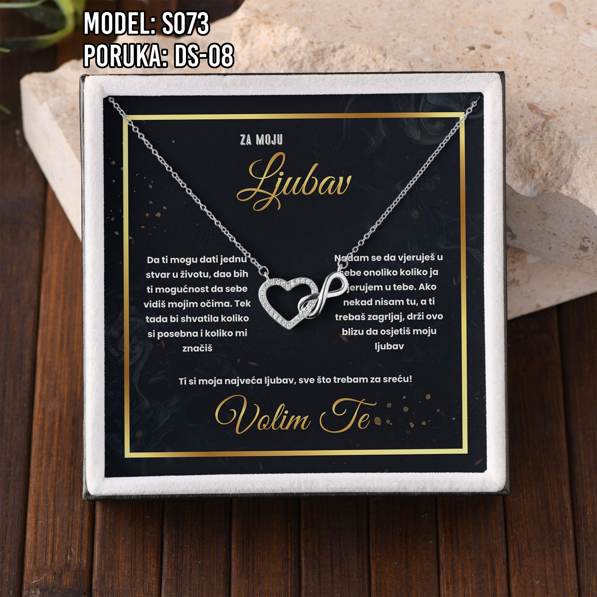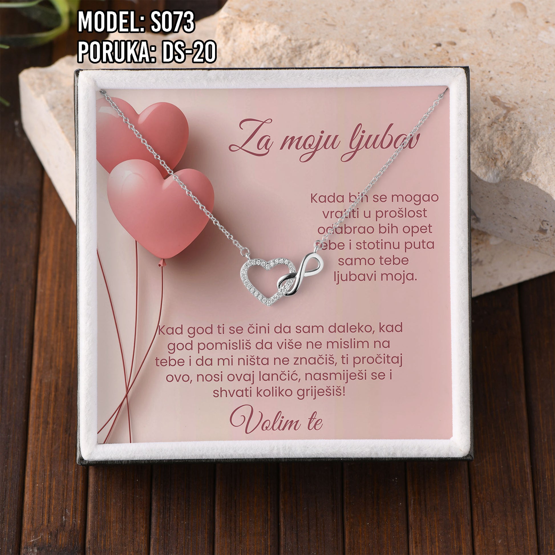 Poklon koji govori umjesto tebe. Model S073 spaja simbol srca i beskonačnosti – za ljubav koja traje. Savršen je izbor za Valentinovo, rođendan, godišnjicu ili kao nježan znak pažnje prema supruzi ili djevojci.