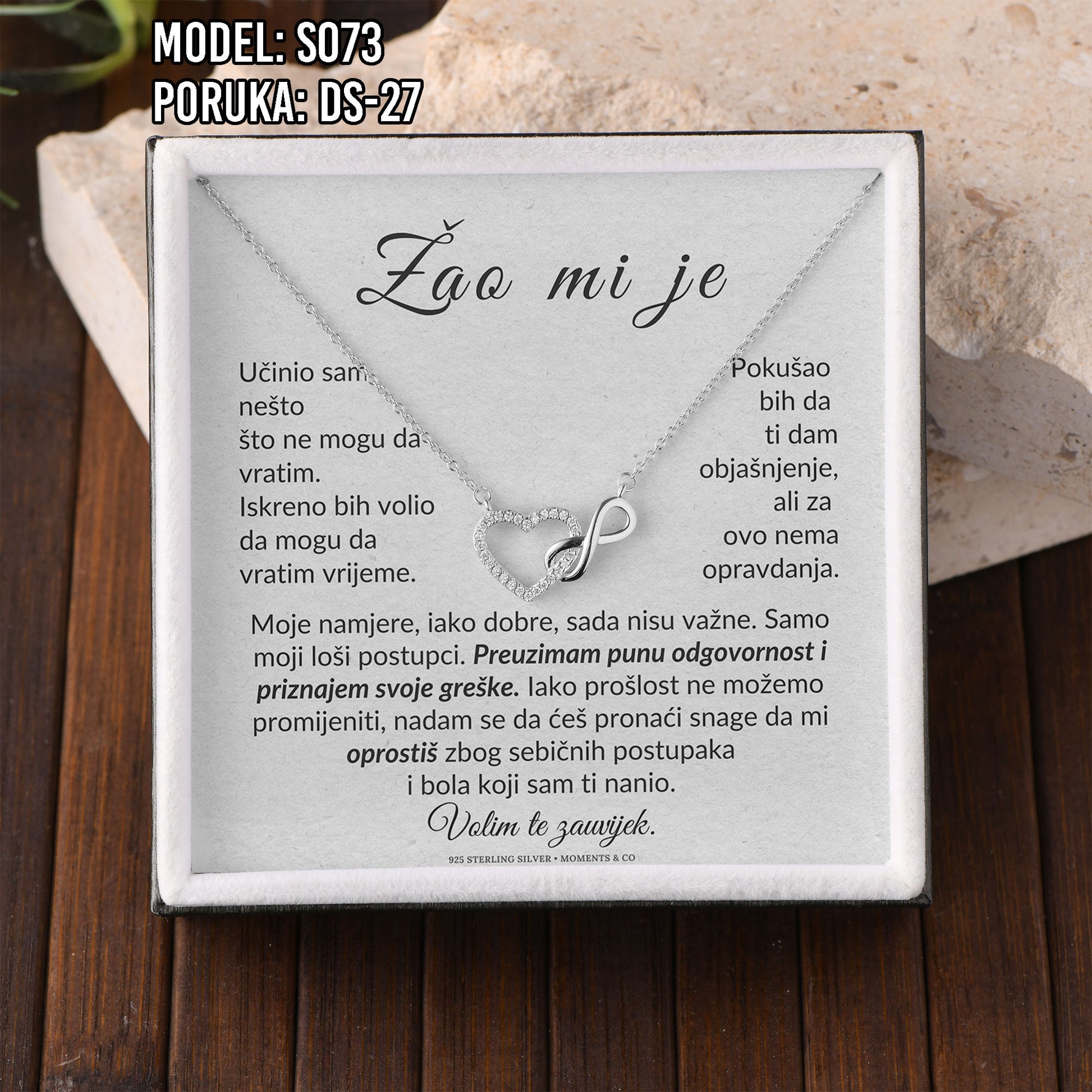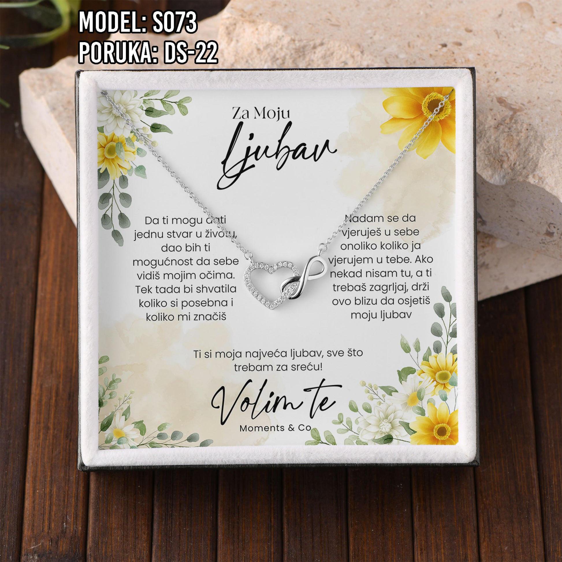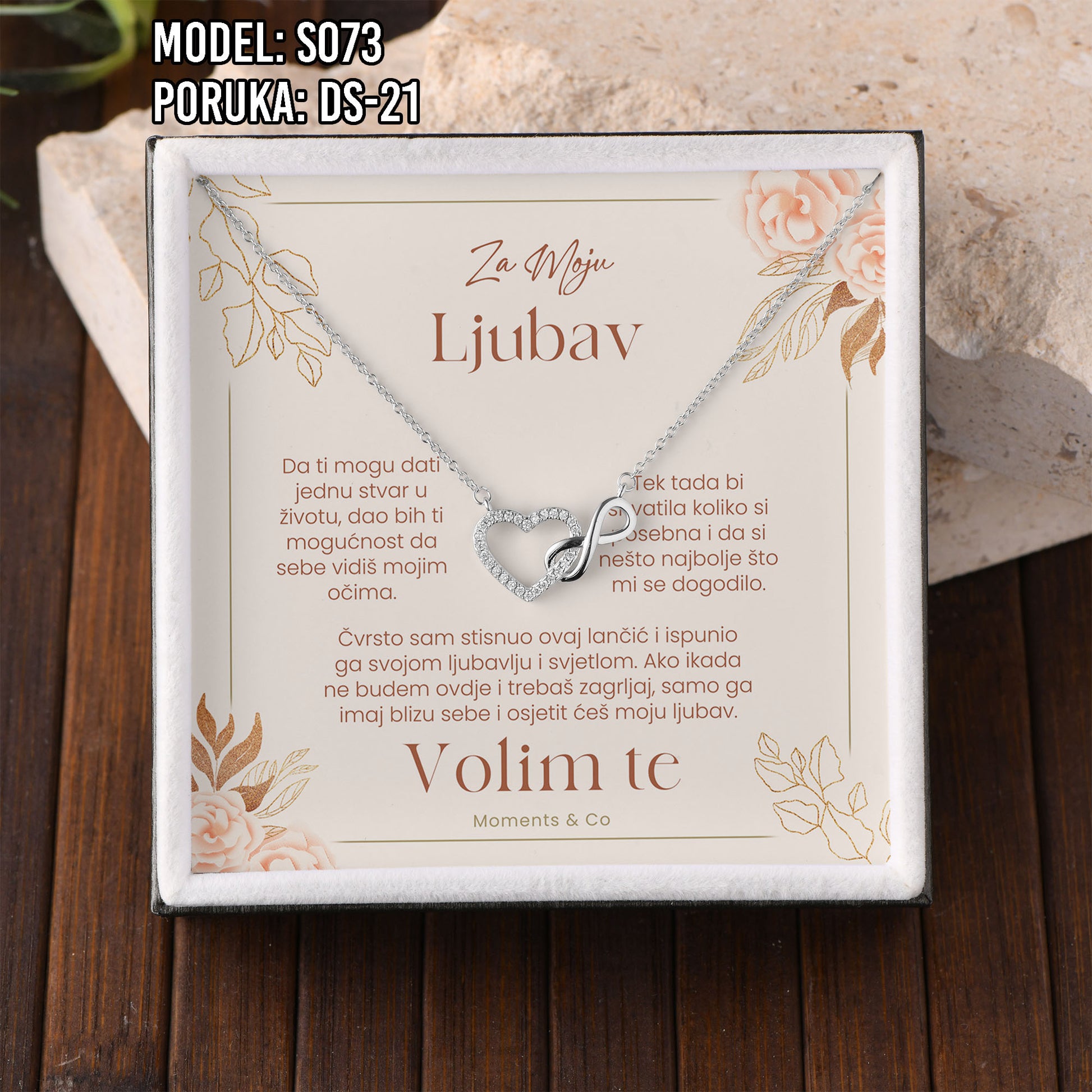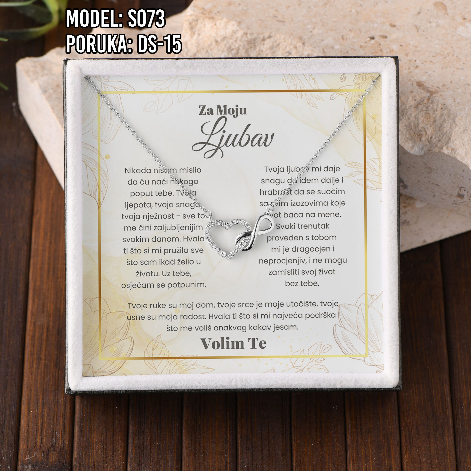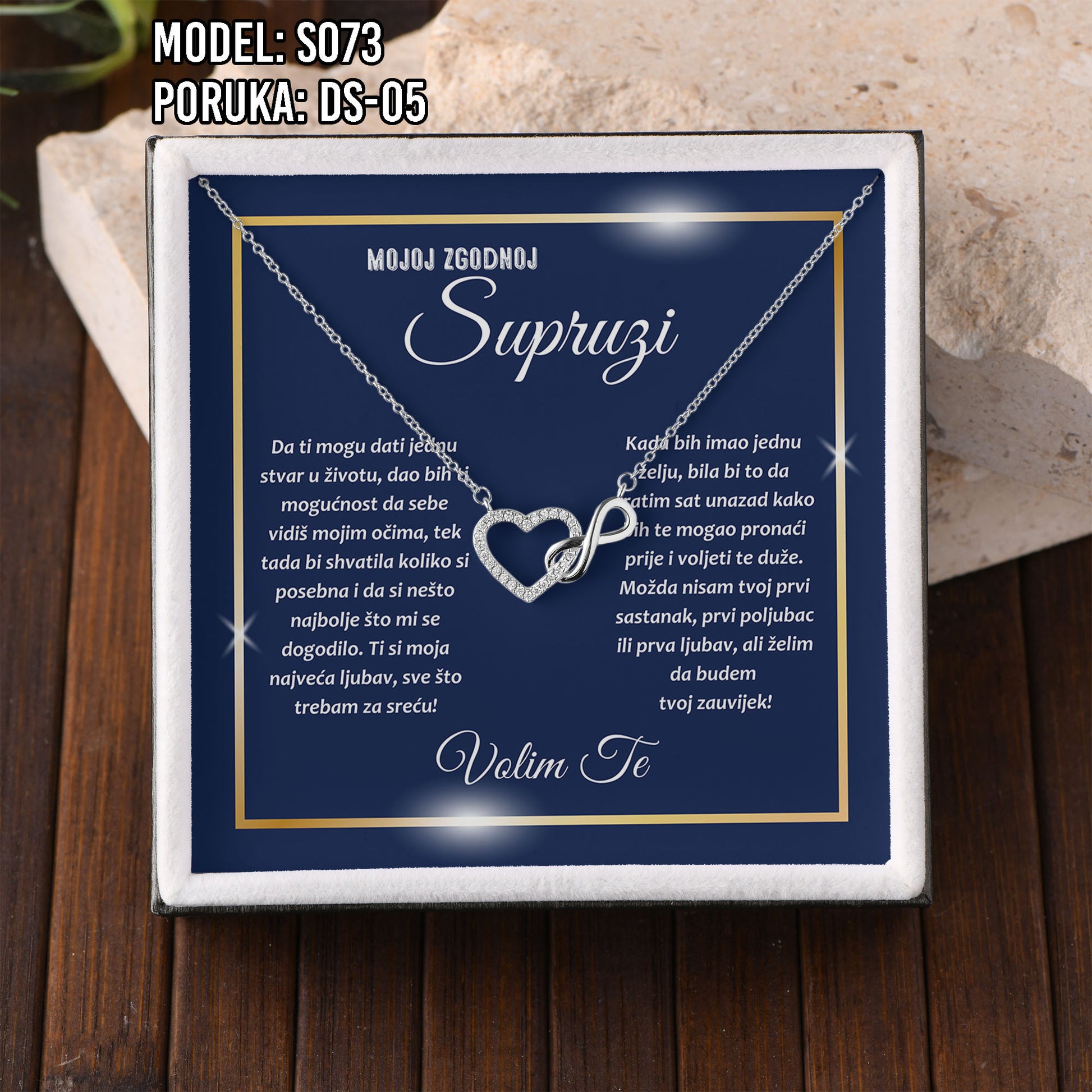 Poklon koji govori umjesto tebe. Model S073 spaja simbol srca i beskonačnosti – za ljubav koja traje. Savršen je izbor za Valentinovo, rođendan, godišnjicu ili kao nježan znak pažnje prema supruzi ili djevojci.